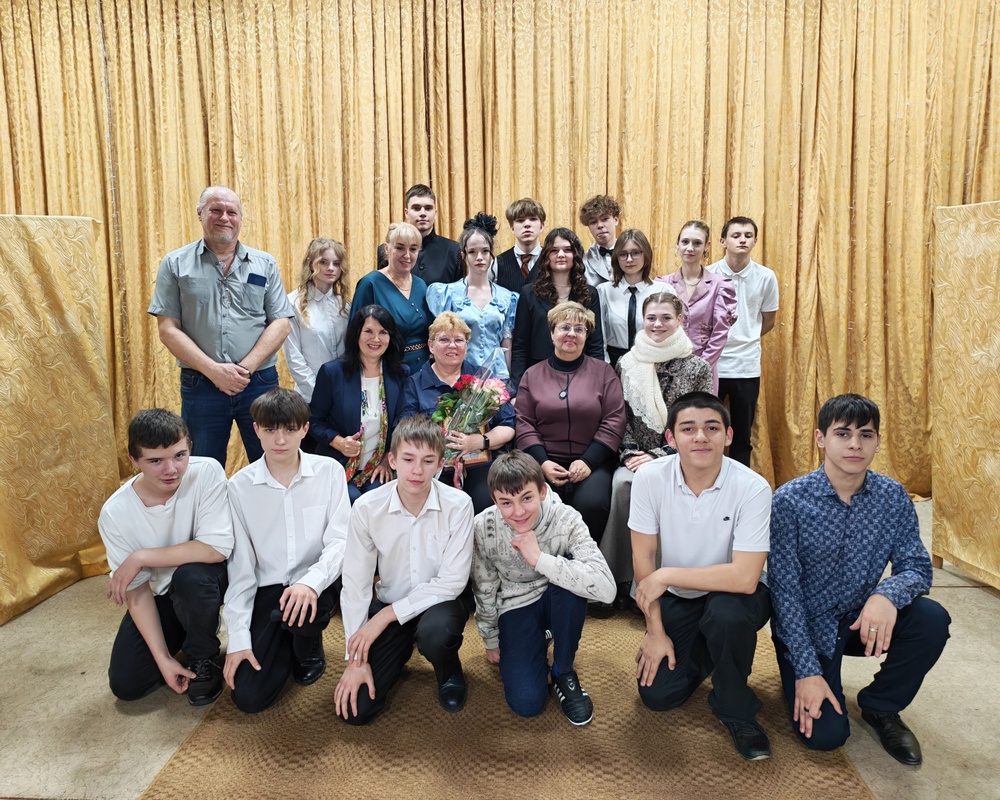 В завершении праздника юных актёров поздравила руководитель филиала Булохова Н.С. Она также вручила руководителю студии Фроловой Н.В. и звукорежиссеру Ковалю Э.А. благодарственные письма и цветы. К поздравлению присоединись члены попечительского совета филиала Сорокина Н.А. и Халецкая Н.А. Они вручили театральные премии ученикам 11 класса Чебере Дарье и Шляхтину Александру. Праздник закончился общим фото театрального коллектива.