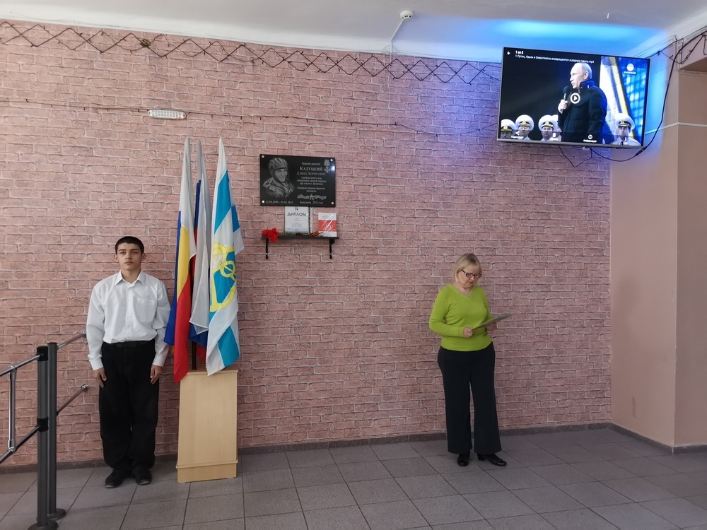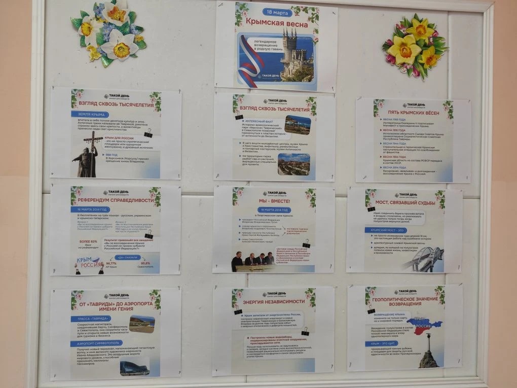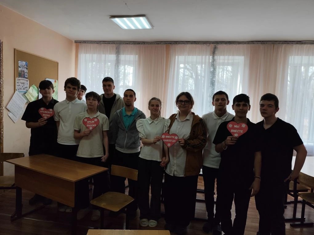 В.В. Путин подписал межгосударственный Договор о принятии Крыма и Севастополя в состав Российской Федерации. В соответствии с этим договором в составе России образовалось два новых субъекта – Республика Крым и город федерального значения -Севастополь. Участникам линейки был показал фрагмент торжественного концерта в Севастополе 2014 года, на котором президент Российской Федерации В.В. Путин приветствовал это важное историческое событие и назвал его «Крымской весной». А также был представлен видеоролик, рассказывающий о тесной связи истории Крымского полуострова с историей России. Завершилась линейка чтением стихотворения, главной мыслью которого были следующие слова: