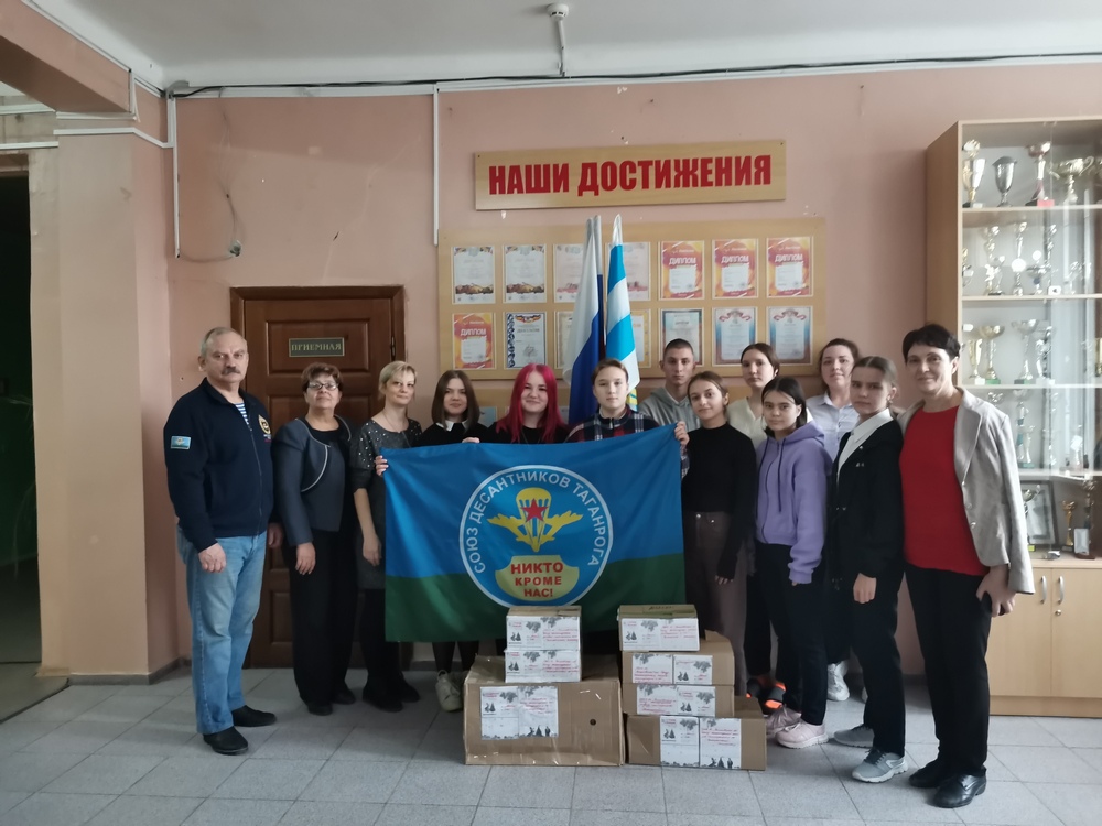 На торжественной линейке ребята передали свои письма, продукты питания, медикаменты и другие необходимые вещи  председателю «Союза десантников Таганрога» гвардии майору запаса А.А Сетькову, который вместе с волонтерами движения «Никто, кроме нас» передал новогодние гостинцы нашим защитникам.