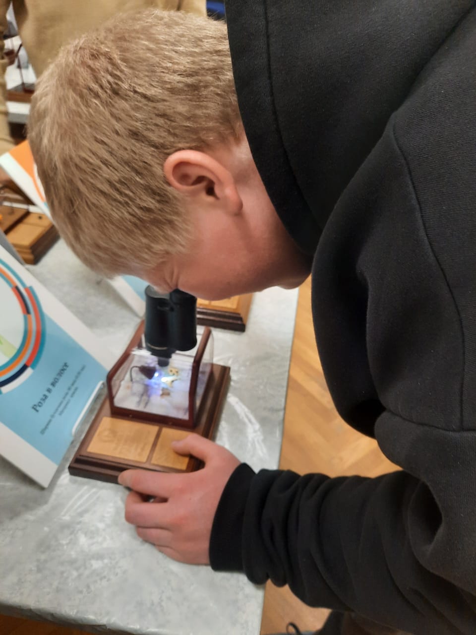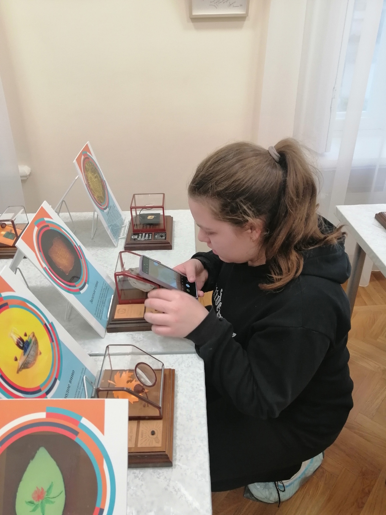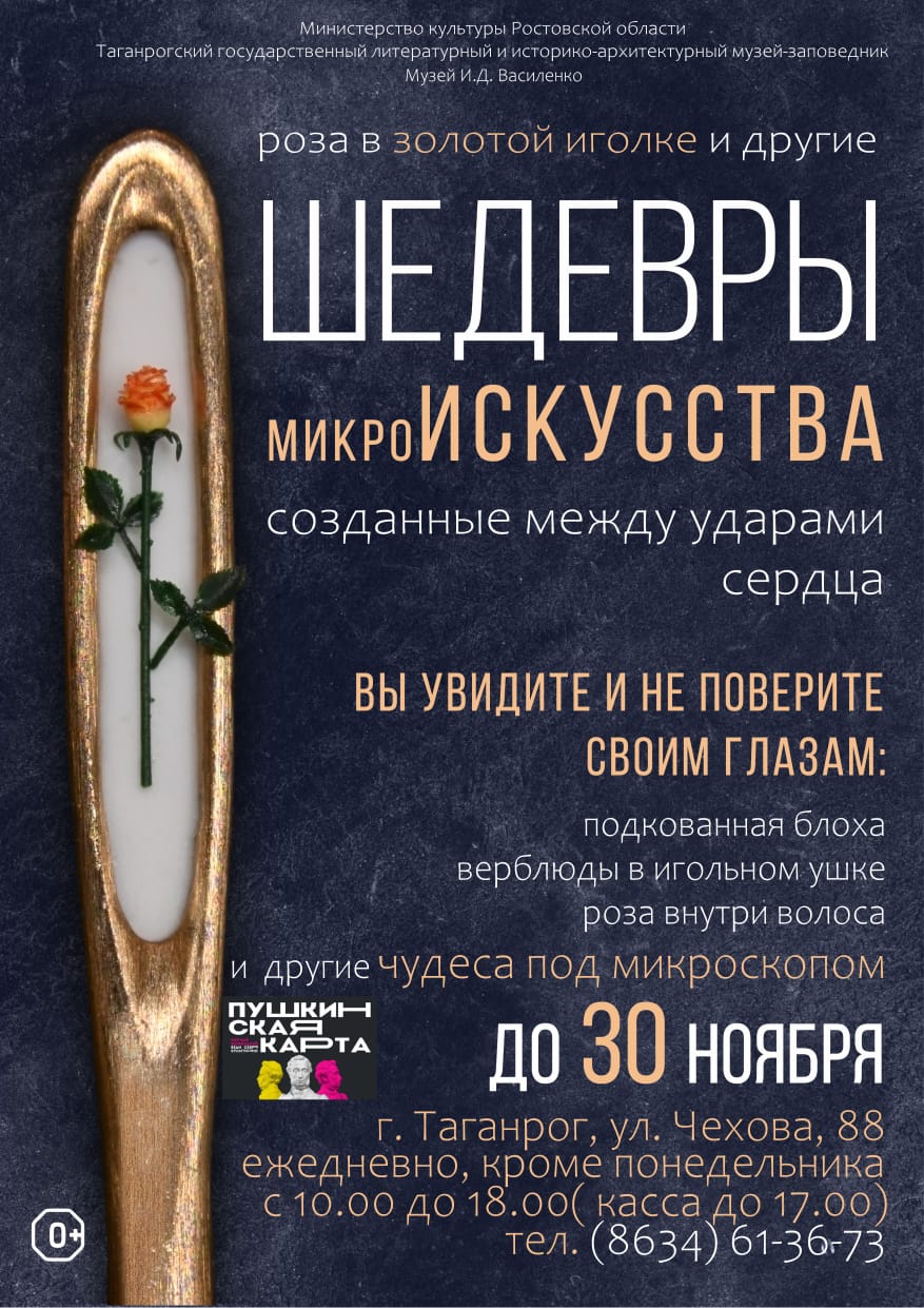 В музее таганрогского писателя И.Д. Василенко разместилась необычная для нашего города выставка. Название «Шедевры микроискусства»  говорит само за себя. На выставке были представлены уникальные работы новосибирского мастера микроминиатюр Владимира Анискина. 24 и 29 ноября 2023 года группа старшеклассников Таганрогского филиала ГКОУ РО «Ростовская-на-Дону санаторная школа-интернат № 74» посетила эту удивительную выставку по Пушкинской карте. Ребят привели в восхищение  работы, выполненные на срезе макового, рисового зернышек и зернышка яблока. Рассмотреть работы можно было только при помощи увеличительных стекол или под микроскопом. Мальчиков, занимающихся спортом,  поразили рисунки  символа чемпионата мира по футболу – Забиваки и кубка УЕФА, выполненные на рисовом зерне. Девочкам больше всего понравилась работа «Роза в волосе», выполненная из пыли, которая была размещена в конском волосе.