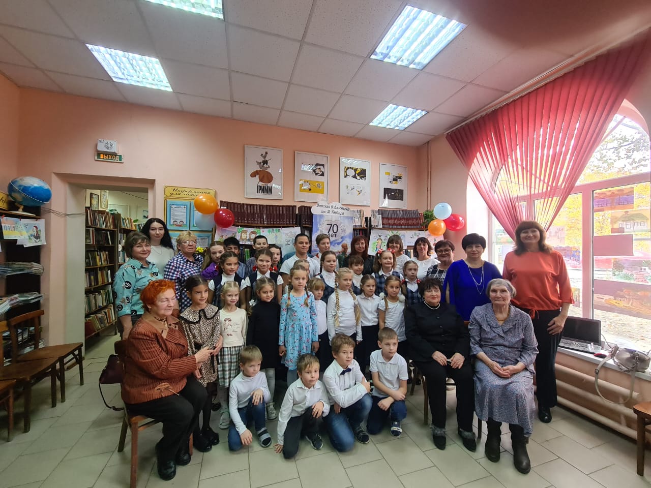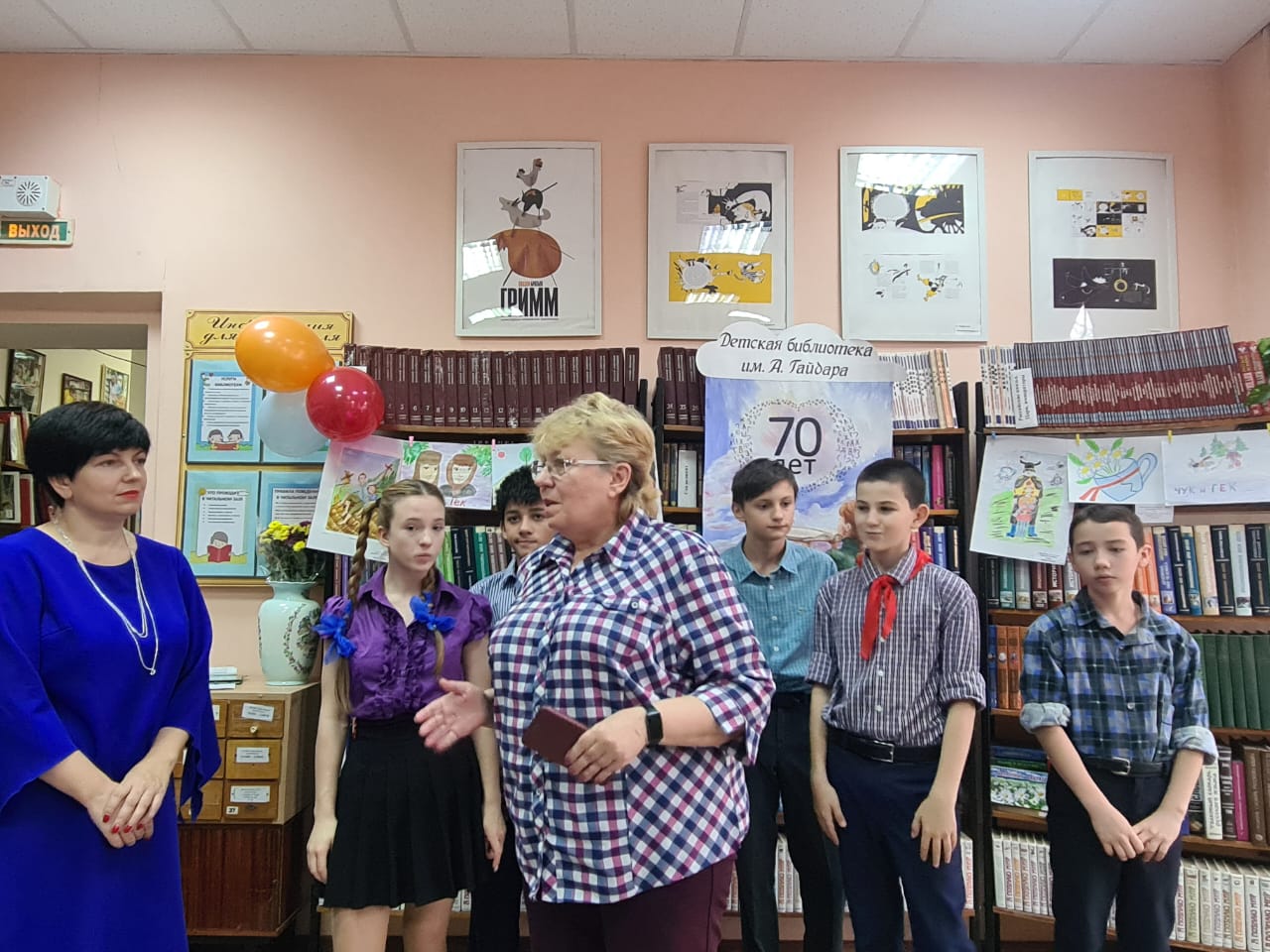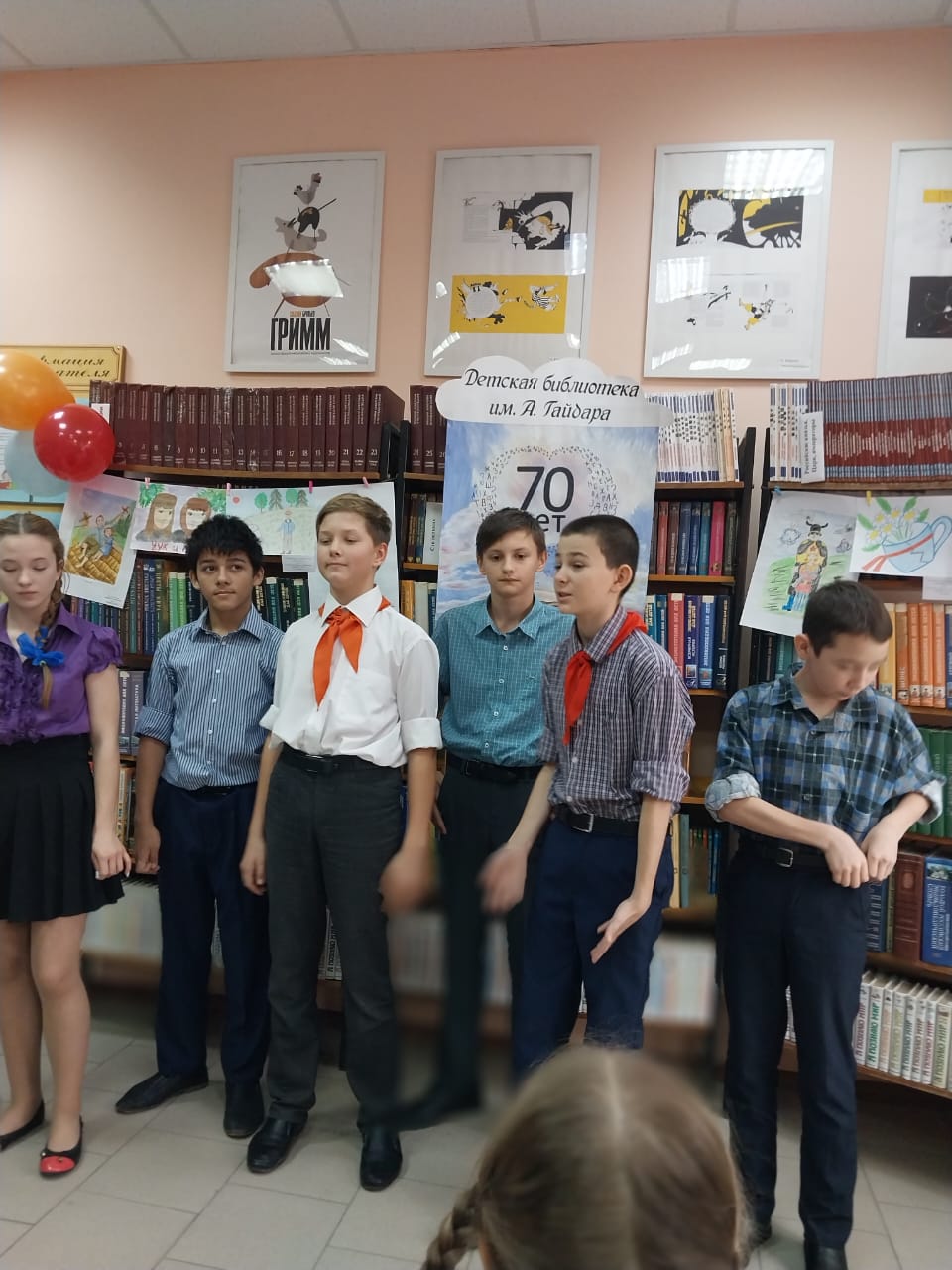 26 октября  2023 года младшая группа Студии театральных миниатюр «Подмостки» (руководитель Фролова Н.В.) пришла в Детскую библиотеку имени А.Гайдара – филиал № 2 МБЦК ЦБС г. Таганрога  поздравить коллектив с юбилеем - 70-летием. В качестве подарка юные актеры подготовили отрывок из произведения А.Гайдара «Тимур и его команда».